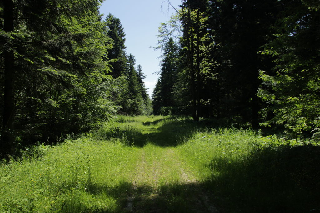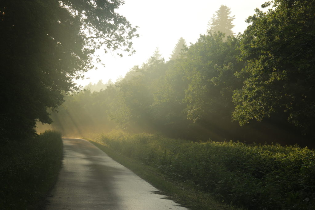Wróciłem na właściwą trasę. Właśnie wybiła 19-ta. Groźne chmury całkiem sobie poszły. Piękne promienie słońca dają znać, że na dziś już kończą pracę. Dzień był gorący, więc rozgrzany las cudownie paruje. W tej scenerii opuszczam cywilizację i idę wąską, asfaltową drogą przez las. Co jakiś czas mijam znaki przypominające, że jestem tu tylko gościem, a gospodarzem są miski. Nagle zza zakrętu wypada czerwony maluszek – w sensie samochód 🙂 Dawno już go nie wiedziałem, dlatego zwróciłem na niego uwagę. Robi się coraz ciemniej i trochę czuję już trudy dzisiejszego marszu. Po prawej stronie, gdzieś w zaroślach słyszę potok, ale nawet nie próbuje się do niego dostać. Za dużo pokrzyw miedzy nami.