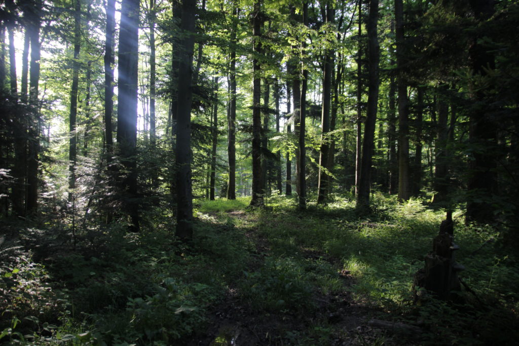 Kolejne 11km to łatwy szlak, z pięknymi widokami, szkoda tylko że z tej strony lasu. Wiem że z drugiej strony rozciąga się piękna panorama na Solinę. W tych lasach pierwszy raz oprócz śladów niedźwiedzi spotykam również tak wyraźne ślady wilków. Idę powoli jak na moje normalne tempo. Zmęczenie wychodzi ze mnie dużo wcześniej niż w poprzednich dniach, pewnie przez to słoneczko… Dziś w sumie wyjdzie koło 10km mniej niż wczoraj, więc nie przejmuję się tym specjalnie. Schodzę w dół patrząc na Otryt, który będę zdobywał jutro na śniadanie.