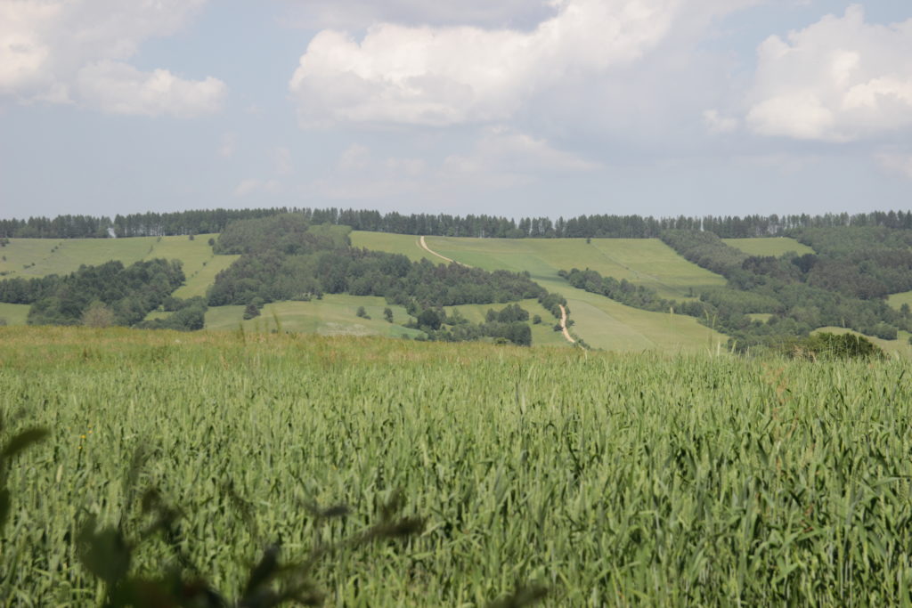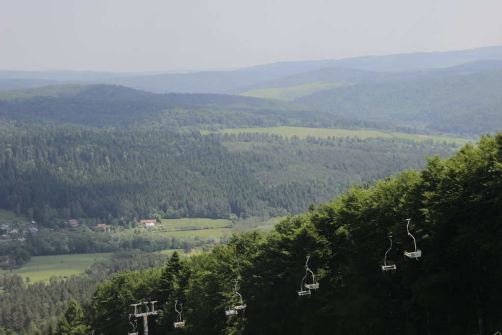 Idę przez las. Szlak w tym miejscu jest całkiem dobry jak na „niebieskie standardy”. Schodzę w dół i przecinam drogę tylko po to, żeby zaraz znowu wejść na kolejne wzgórze. Jest godzina 8:30 ale słońce już pokazuje, że dziś na pewno nie zmarznę… Jestem trochę odwodniony, mimo tego że pije całkiem sporo i przy każdej okazji. Zdobywam kolejną górę i widzę że kolejne podejście już nie będzie takie szybkie. Przede mną rozciąga się piękny widok na wielki dział z wyciągiem na Kamienną Lawortę, za którym schowały się Ustrzyki Dolne. Cieszy mnie ten widok, bo oznacza to, że góry Sanocko-Turczańskie przejmują władzę i żegnam pogórze Przemyskie na dobre. Geograficznie te granice może są inne, ale po wybitności szczytów i stromiznach na podejściach szybko można odczuć, że jest się w innej krainie.